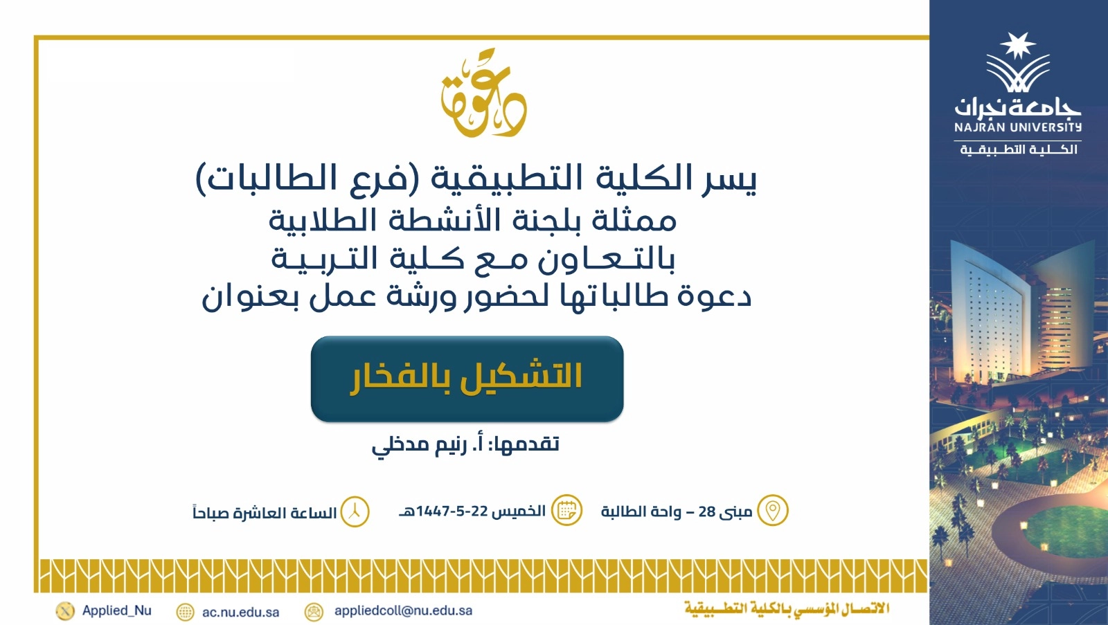 الكلية التطبيقية - فرع الطالبات - ممثلة بلجنة الأنشطة الطلابية وبالتعاون مع كلية التربية تدعو طالبات الكلية حضور ورشة عمل بعنوان " التشكيل بالفخار " – الفصل الدراسي الأول 1447