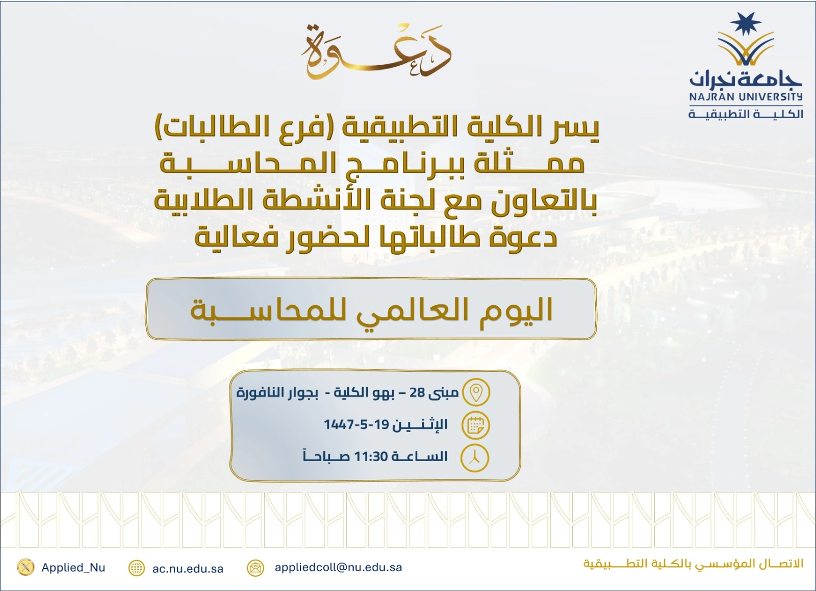 برنامج المحاسبة وبالتعاون مع لجنة الأنشطة الطلابية في الكلية التطبيقية – فرع الطالبات – تدعو طالبات الكلية حضور فعالية اليوم العالمي للمحاسبة – الفصل الأول 1447 - Applied College