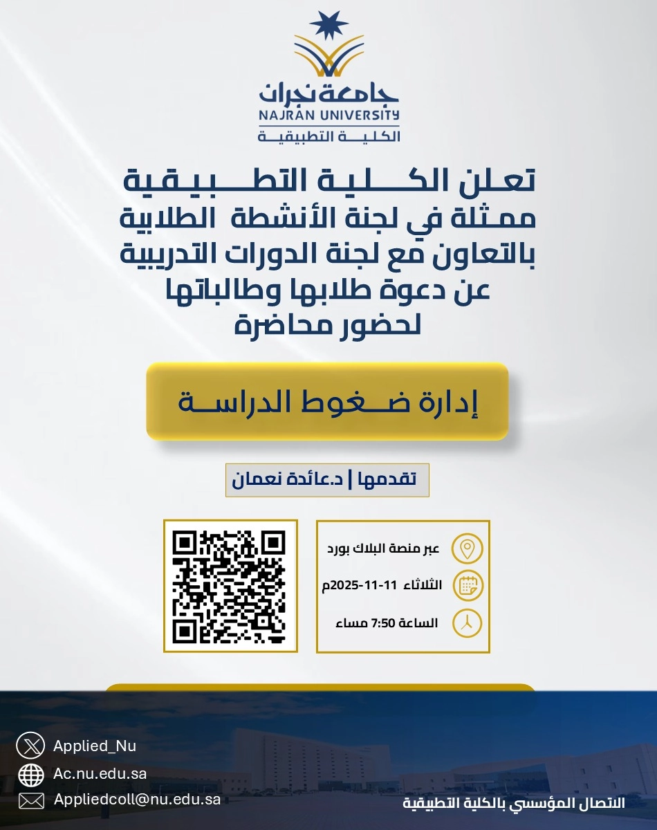لجنة الأنشطة الطلابية بالتعاون مع لجنة الدورات التدريبية في الكلية التطبيقية تدعو طلبة الكلية لحضور محاضرة بعنوان " إدارة ضغوط الدراسة " – الفصل الدراسي الأول 1447 - Applied College