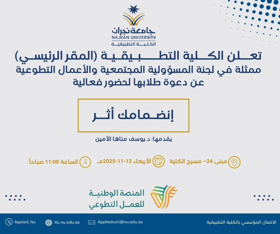 لجنة المسؤولية المجتمعية والأعمال التطوعية في الكلية التطبيقية - المقر الرئيسي – تدعو طلاب الكلية حضور فعالية " انضمامك أثر " – الفصل الدراسي الأول 1447 - Applied College