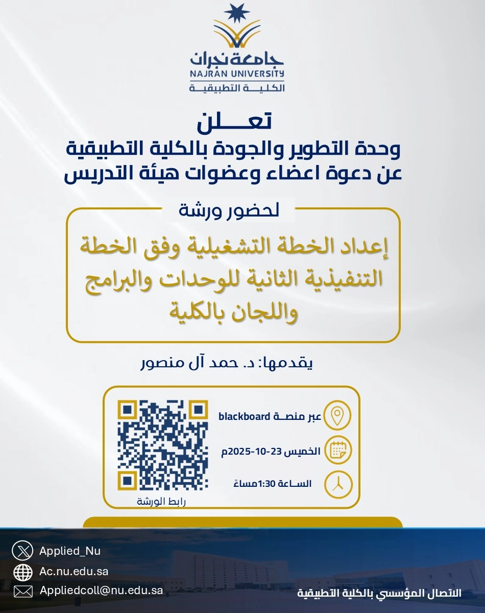 وحدة التطوير والجودة بالكلية التطبيقية تدعو اعضاء وعضوات هيئة التدريس لحضور ورشة بعنوان " إعداد الخطة التشغيلية وفق الخطة التنفيذية الثانية للوحدات والبرامج واللجان بالكلية " - الفصل الدراسي الأول 1447