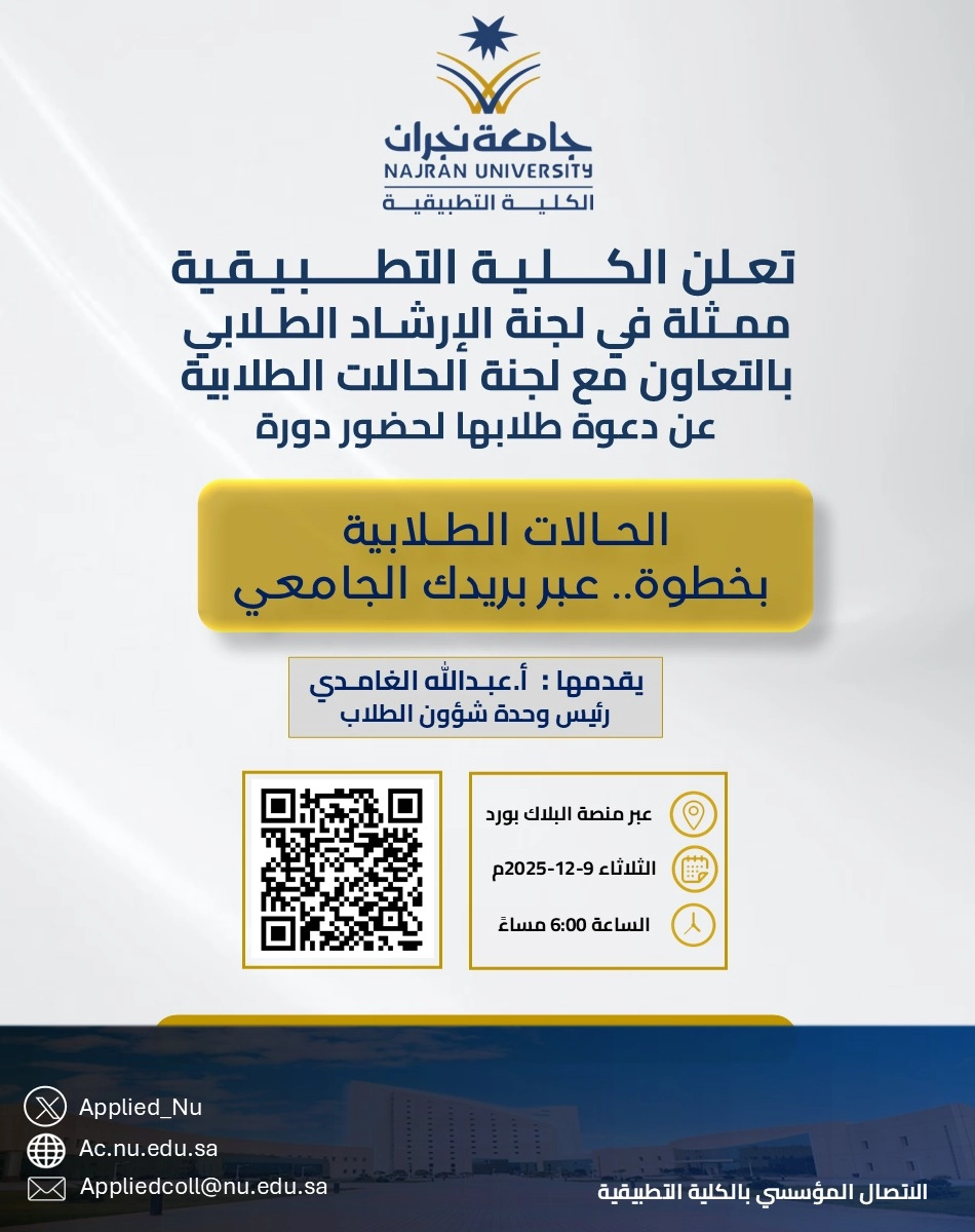 لجنة الإرشاد الطلابي بالتعاون مع لجنة الحالات الطلابية في الكلية التطبيقية – المقر الرئيسي - تدعو طلاب الكلية حضور دورة " الحالات الطلابية بخطوة .. عبر بريدك الجامعي " – الفصل الأول 1447