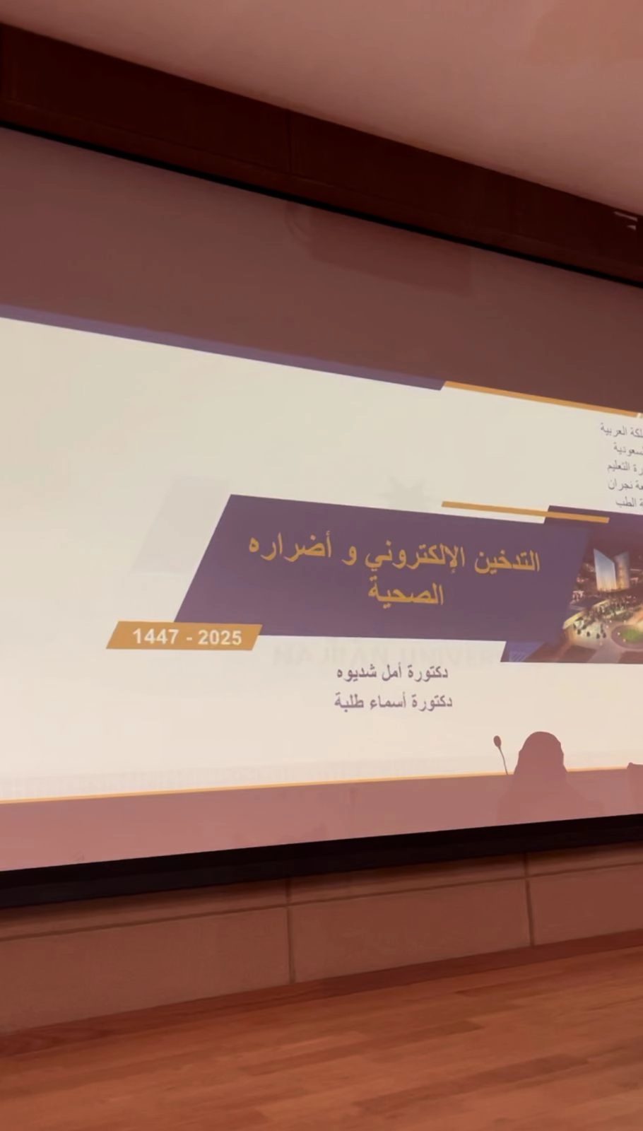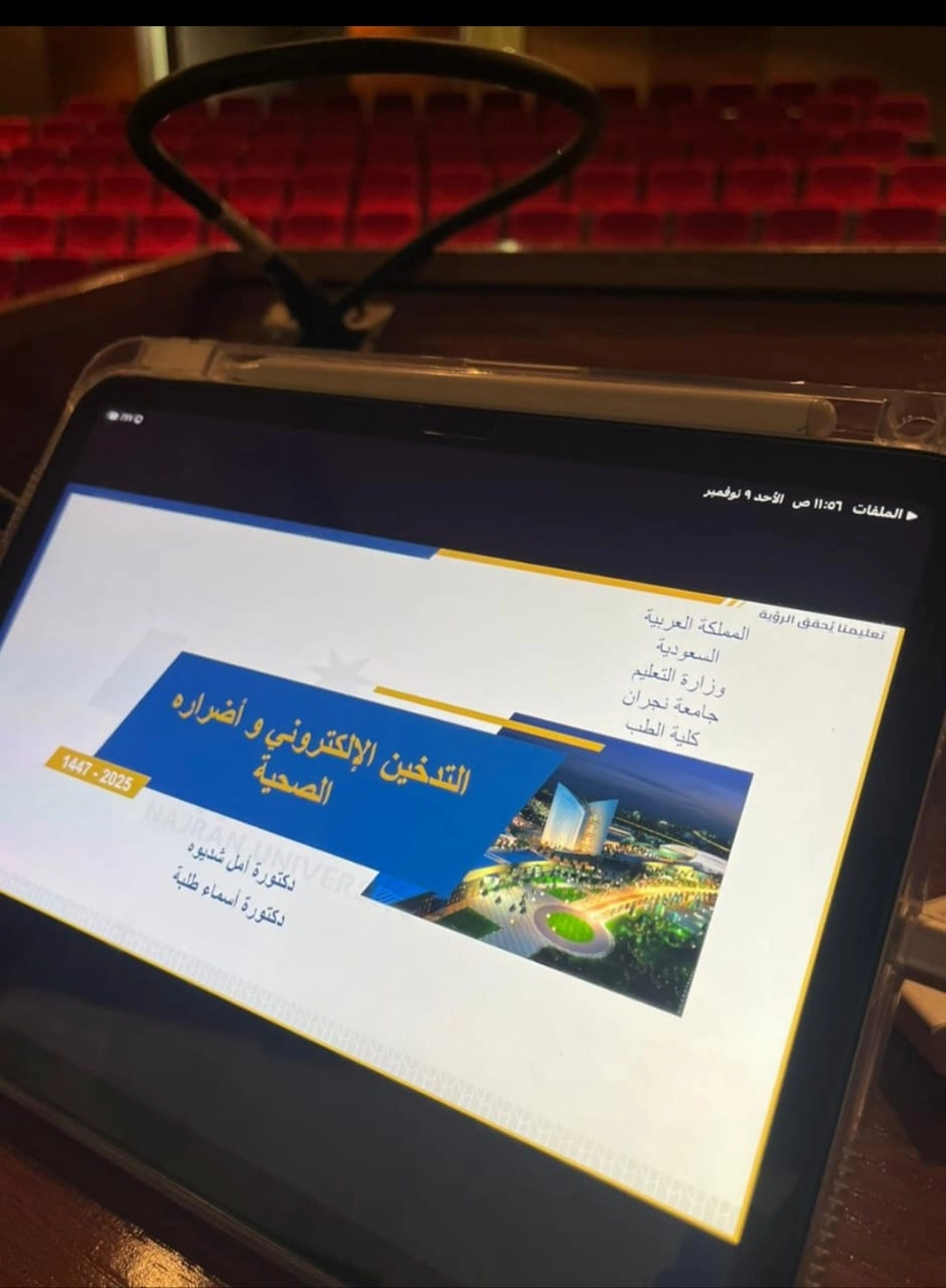 الكلية التطبيقية – فرع الطالبات – ممثلة بلجنة الأنشطة الطلابية وبالتعاون مع كلية الطب تنظم محاضرة توعوية بعنوان " الشيشة الإلكترونية وأضرارها الصحية " – الفصل الأول 1447