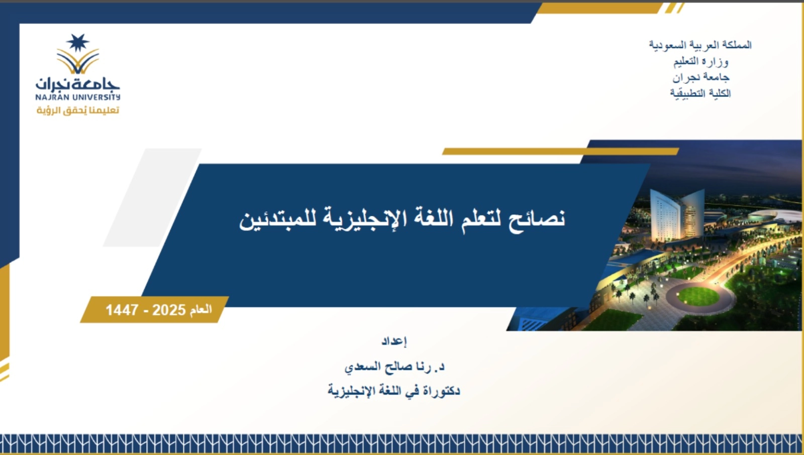 لجنة الأنشطة الطلابية بالتعاون مع لجنة الدورات التدريبية في الكلية التطبيقية تنظم محاضرة بعنوان " نصائح لتعلم اللغة الإنجليزية للمبتدئين " – الفصل الدراسي الأول 1447