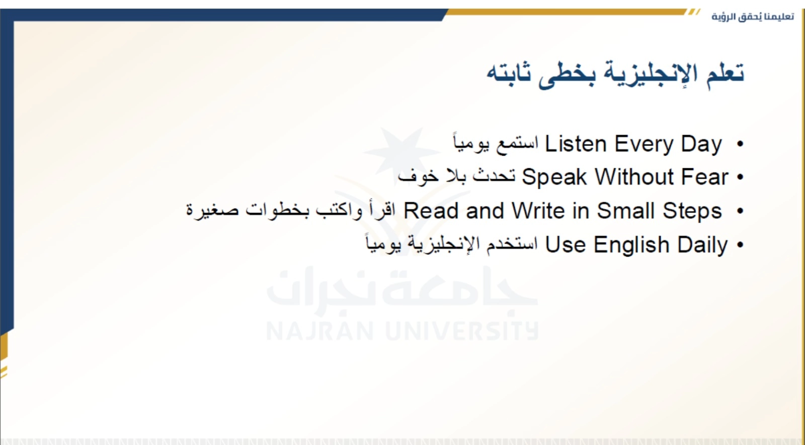 وتحدثت فيها الدكتورة رنا السعدي في عدة محاور تتضمن تعلم استراتيجيات عملية لتحسين اللغة الإنجليزية واكتساب الثقة في التحدث، الاستماع، القراءة، والكتابة، بالإضافة الى إنشاء روتين يومي بسيط للتعلم، كما تحدثت عن كيفية تحديد مصادر مفيدة لمساعدة الطلبة في عملية التعلم.