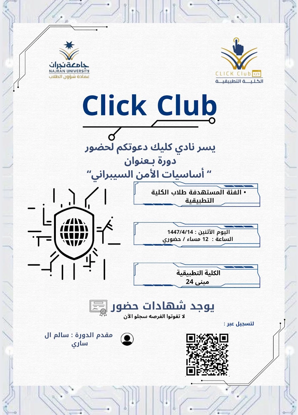 null نادي كليك في الكلية التطبيقية – المقر الرئيسي – يدعو طلاب الكلية لحضور دورة تدريبية بعنوان " أساسيات الأمن السيبراني " - الفصل الدراسي الأول 1447