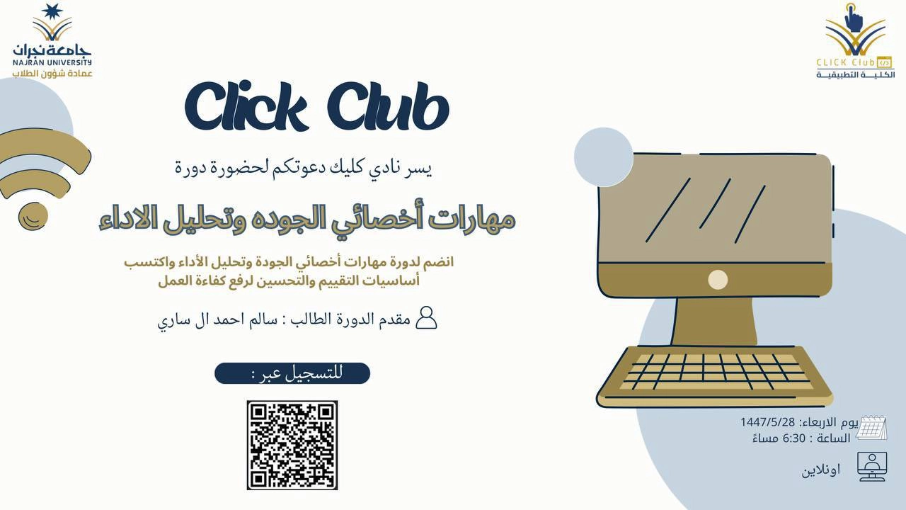 null Click Club at the Applied College invites all Najran University students to attend a training course organized by the club titled "Quality Specialist Skills and Performance Analysis" – First Semester, 1447