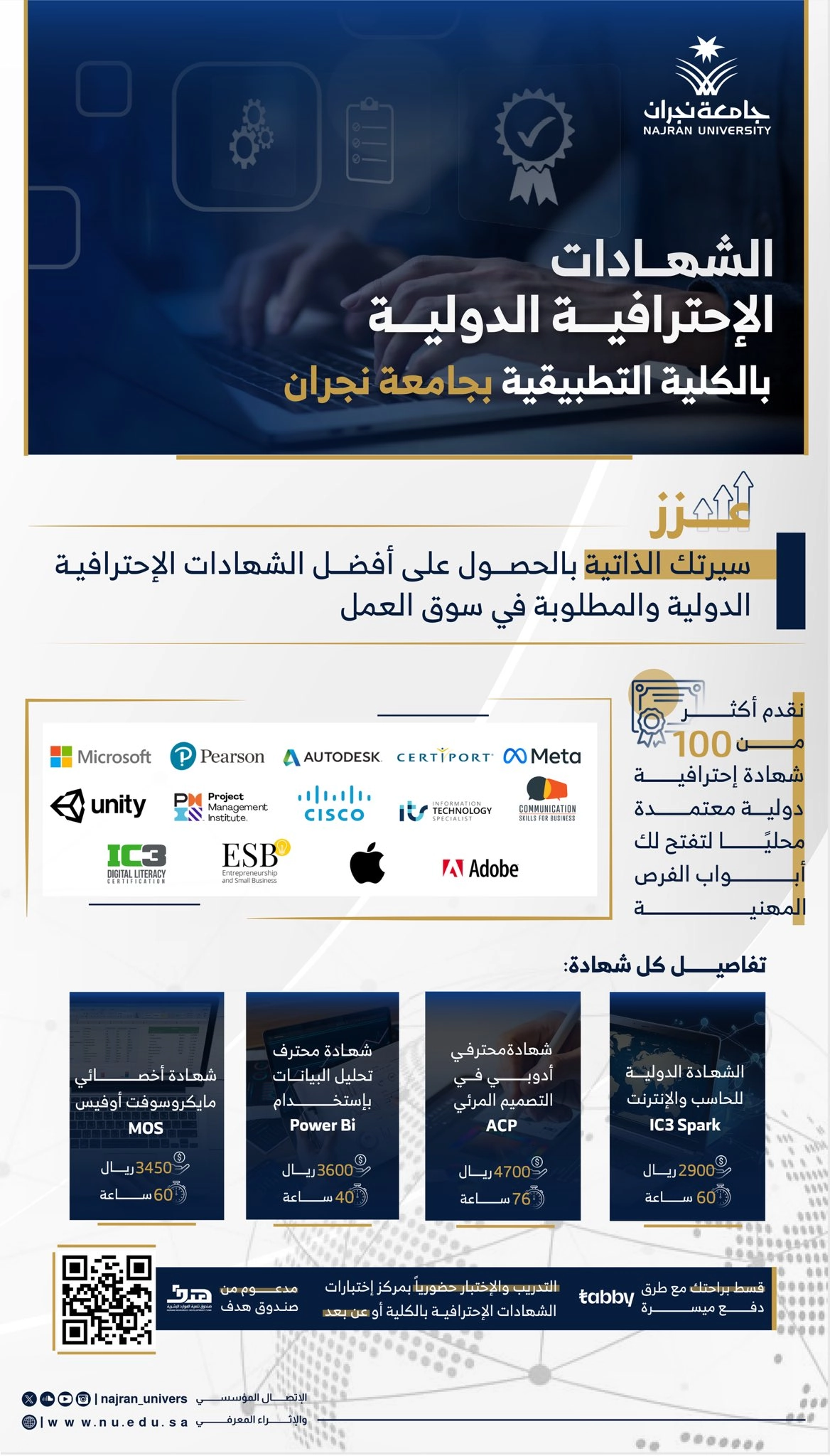 The Applied College, represented by the Training and Skills Development Unit – Professional Certification Committee – invites you to obtain accredited international professional certificates to enhance your CV with skills required in the job market – First Semester, 1447