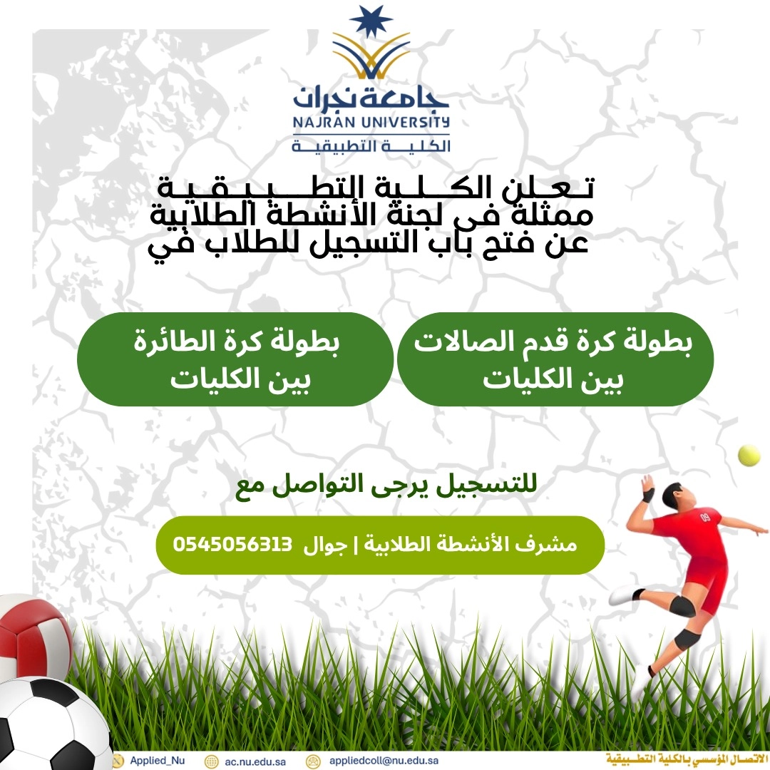 The Student Activities Committee at the Applied College – Main Campus – announces the opening of registration for the Futsal Football Championship and the Volleyball Championship between colleges – First Semester 1447 - Applied College