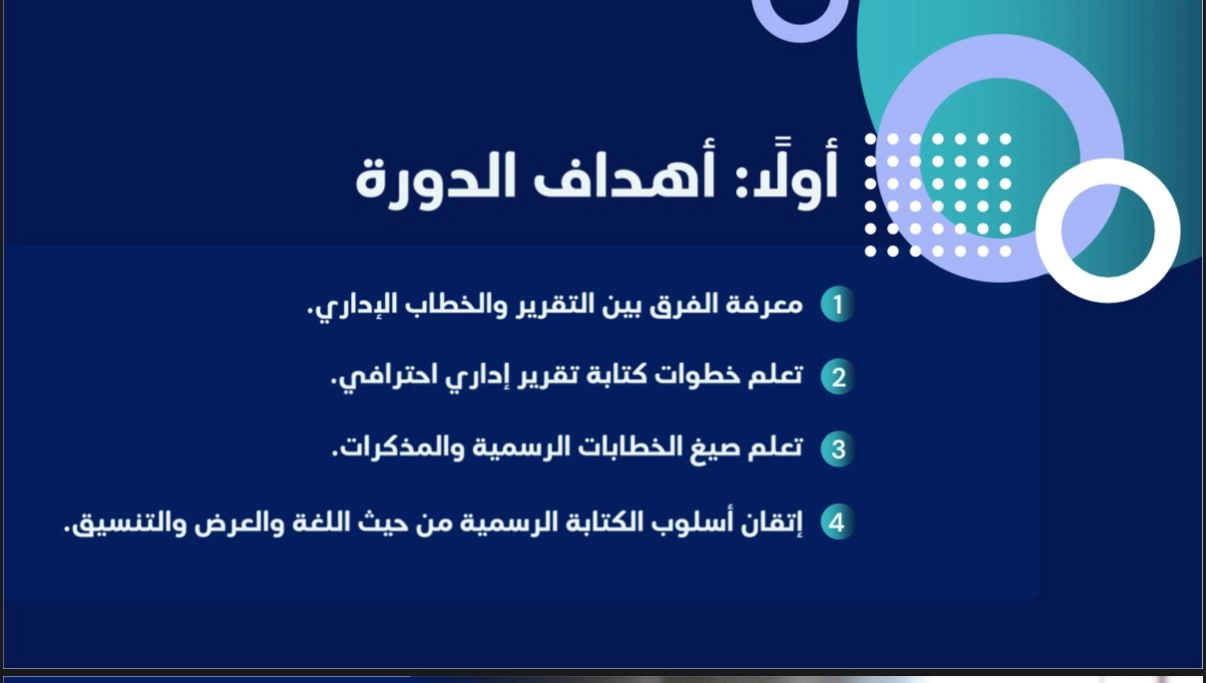 The course aimed to enable both male and female students to professionally prepare reports and draft administrative letters according to the approved methods used within official institutions.