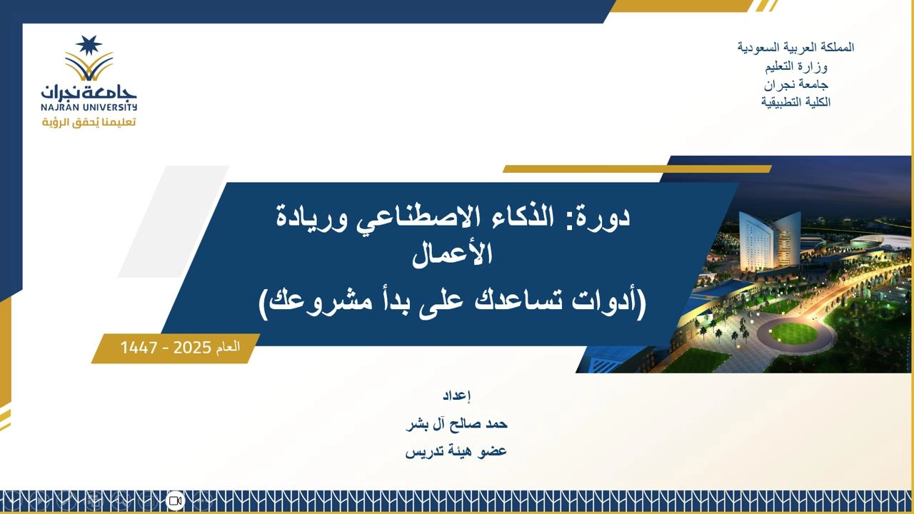 The Applied College, represented by the Training and Skills Development Unit (Training Courses Committee), and in cooperation with the Community Responsibility Department at Najran University, organized a community training course titled "Artificial Intelligence and Entrepreneurship – Tools to Help You Start Your Project" – First Semester, 1447 - Applied College