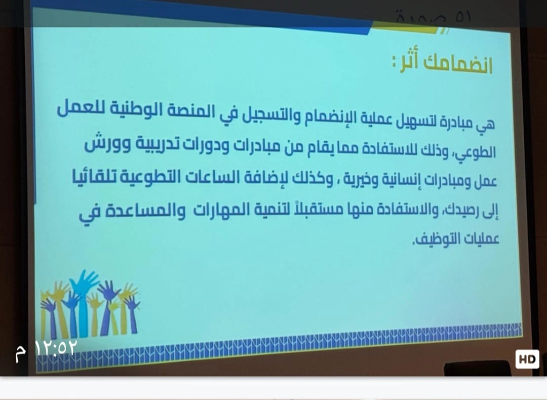 In affirmation of the importance of volunteer work, the Applied College – Main Campus – represented by the Community Responsibility and Volunteer Work Committee, held the event on Wednesday, 21-5-1447 AH (corresponding to November 12, 2025). The event, titled "Your Participation Makes an Impact," was presented by Dr. Youssef Manaha Al-Ameen, who discussed the significance of volunteering and how to register on the National Volunteer Work Platform.