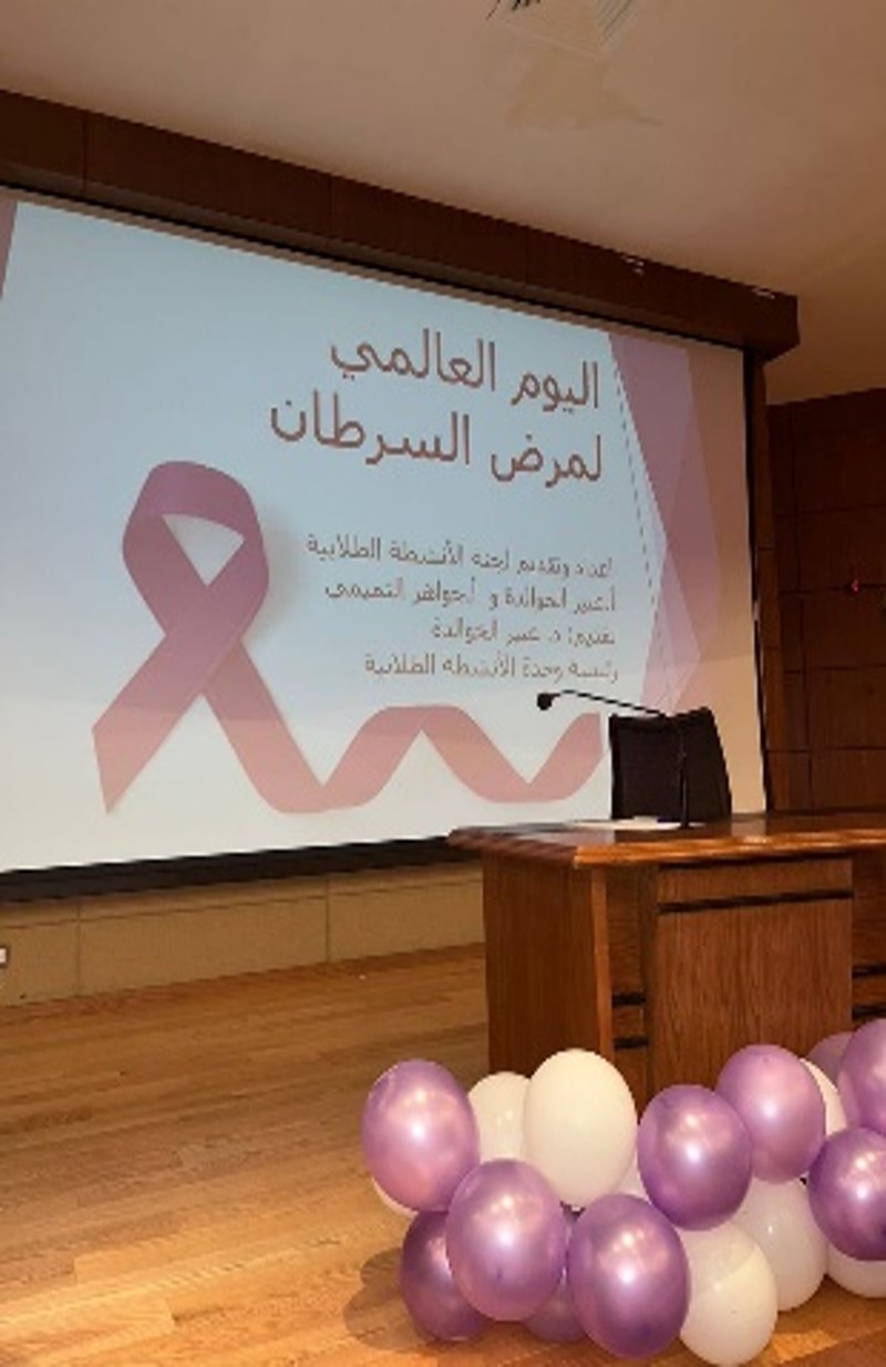 اقامت لجنة الأنشطة الطلابية في الكلية التطبيقية فرع الطالبات برنامج توعوي عن مرض السرطان في يوم الخميس 19 رجب 1444هـ الموافق 10 فبراير 2023م الساعة العاشرة صباحا في مسرح الكلية. وبدأ البرنامج بترحيب الأستاذة عبير بالطالبات وأعضاء هيئة التدريس والقرآن الكريم، وبعدها توضيح أهداف البرنامج بمشاركة الطالبات ومشهد تمثيلي تخلله ذكر أنواع مرض السرطان والأعراض المسبقة للمرض وماهية طرق الوقاية منه وعلاجه. بعدها تم عرض فيديو لكيفية الوقاية من المرض. وبعدها وبمشاركة الطالبة سيلا تم عمل الدعم النفسي للمريض، وأيضا بمشاركة الطالبة شهد تم إيضاح كيفية الكشف عن سرطان الثدي، وختام البرنامج كان عبارة عن مسابقة بمشاركة الطالبتين ليلى و وسمية