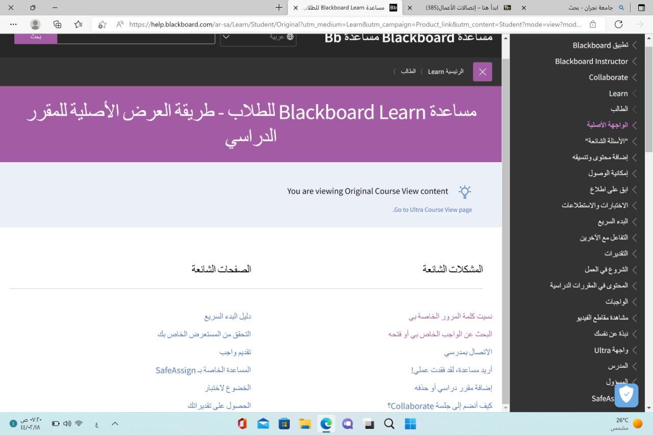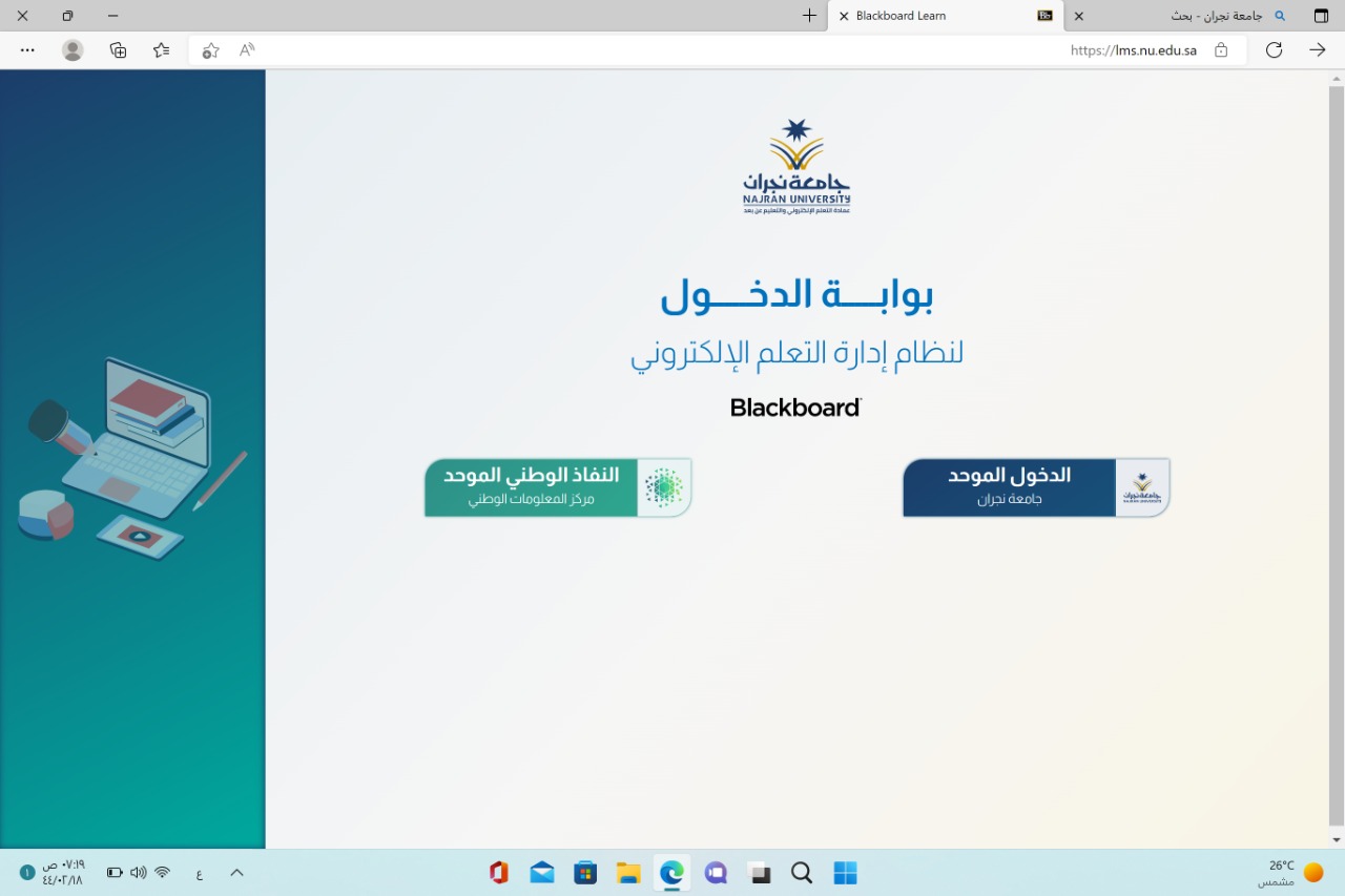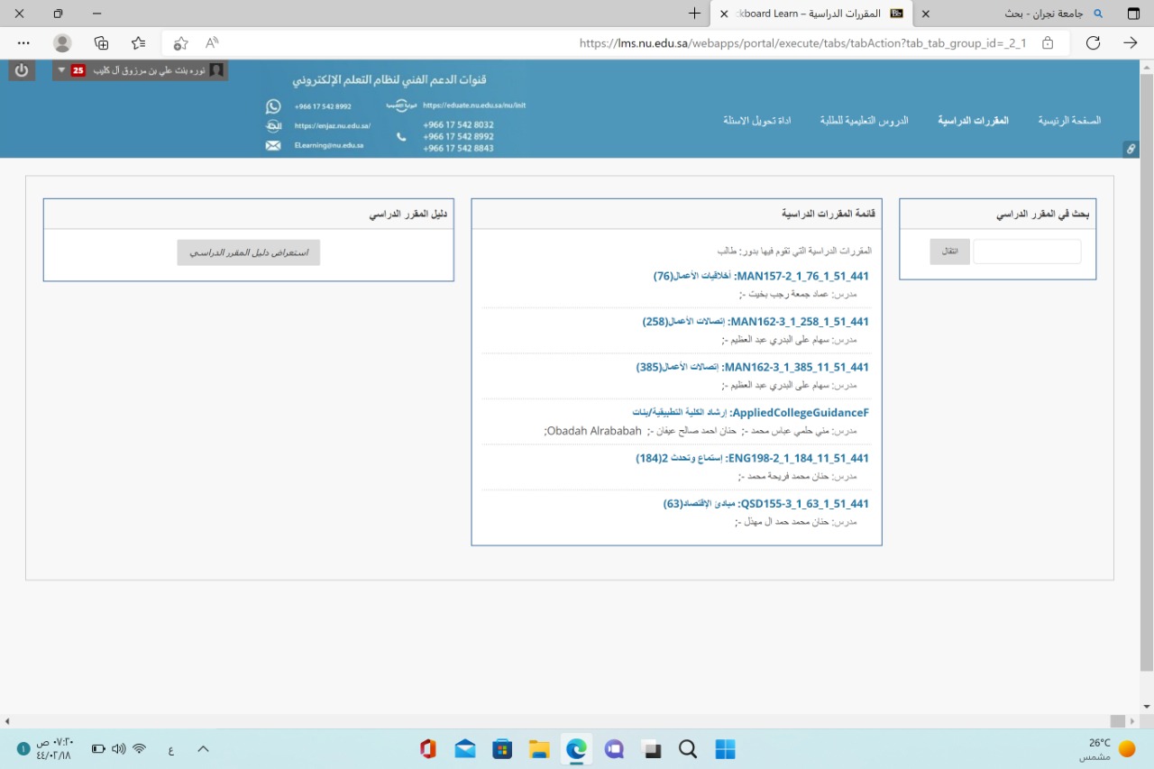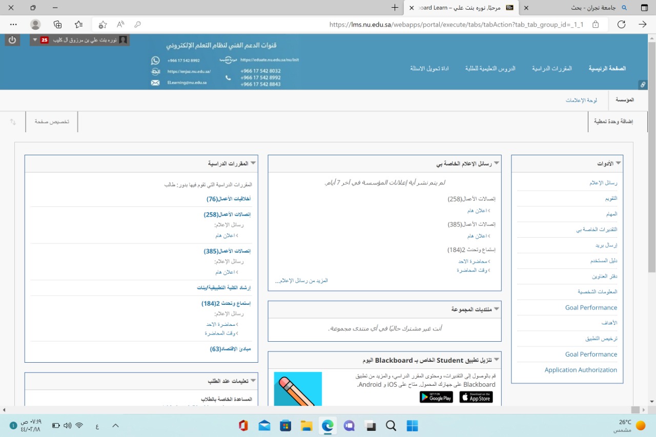 - التعرف على أدوات متنوعة للاطلاع على محتوى المادة العلمية للمقرر والتفاعل معها بطرق ميسره بالإضافة إلى التواصل مع أستاذ المقرر وبقية الطلبة المسجلين في نفس المقرر والدخول على الفصول الافتراضية والمناقشات.