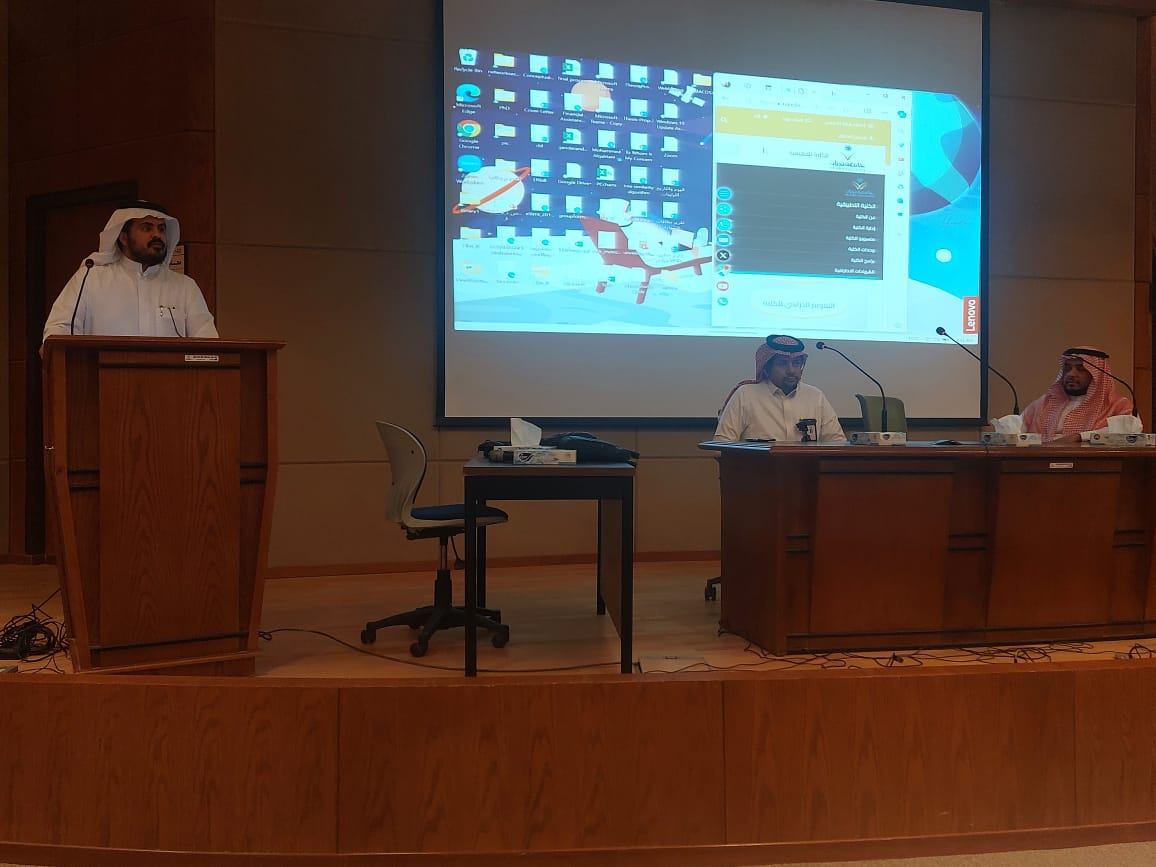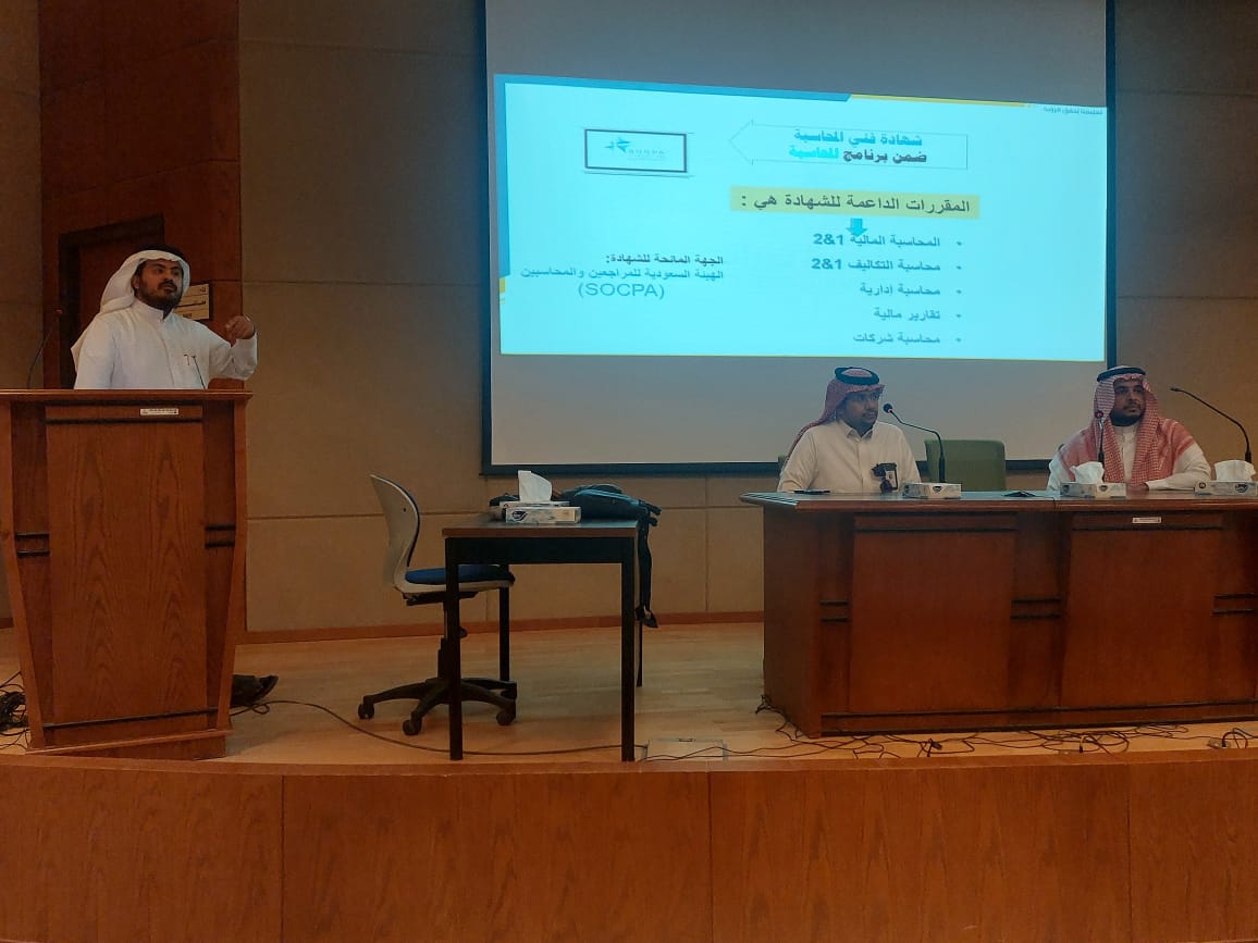 ثم تحدث رئيس وحدة التدريب وتنمية المهارات د. محمد الشهراني عن أهمية الشهادات الاحترافية في مسيرة الطالب العلمية والعملية. بعدها استعرض رئيس لجنة الشهادات الاحترافية الدكتور سلطان المالكي آليات التسجيل في الدورات التأهيلية للحصول على الشهادات الاحترافية التي ستقدمها الكلية لطلابها وطالباتها. وتم مشاركة عدد من الطلبة في الحديث عن طموحاتهم وأهدافهم في الحصول على الشهادات الاحترافية الموائمة لتخصصاتهم